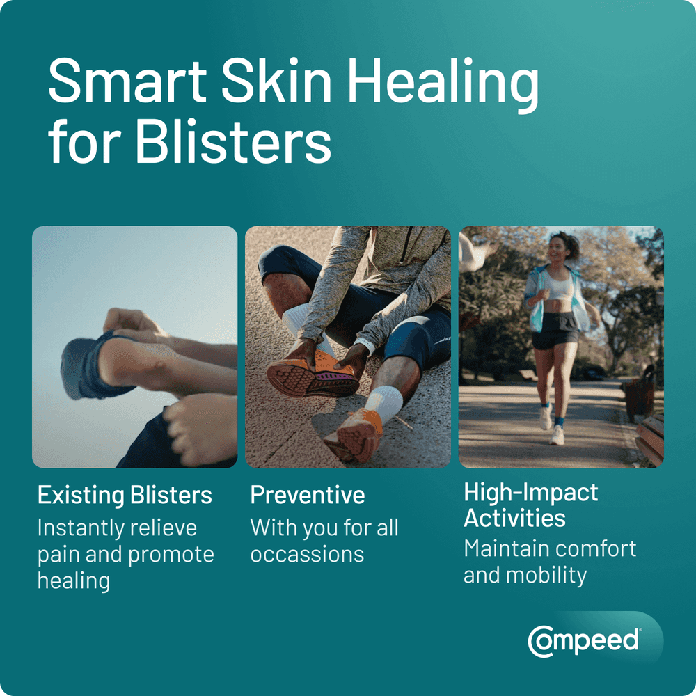 Blisters can take several days to heal. Treatments focus on protecting the blister from further friction. Apply a Compeed plaster to prevent further blistering and provide instant pain relief.