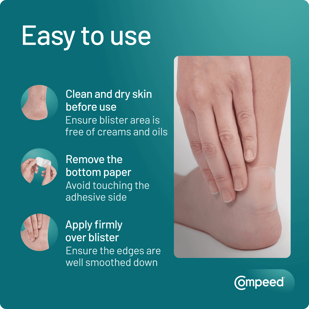 If you're wearing shoes that make you more prone to blisters protect your feet from rubbing and friction with Compeed Blister Plasters. You can also prevent blisters by wearing two pairs of thin socks when exercising. Be sure to read our full blister prevention advice.