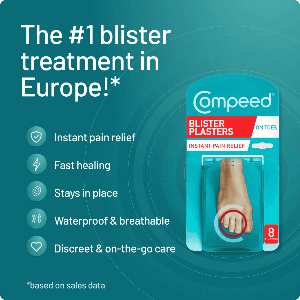 If you’re wearing shoes that make you more prone to blisters, protect your feet from rubbing and friction with Compeed® Blister Plasters. You can also prevent blisters by wearing two pairs of thin socks when exercising.