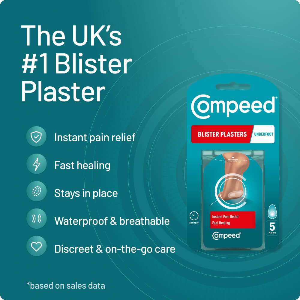 Blisters can take several days to heal. Treatments focus on protecting the blister from further friction. Apply a Compeed plaster to prevent further blistering and provide instant pain relief.